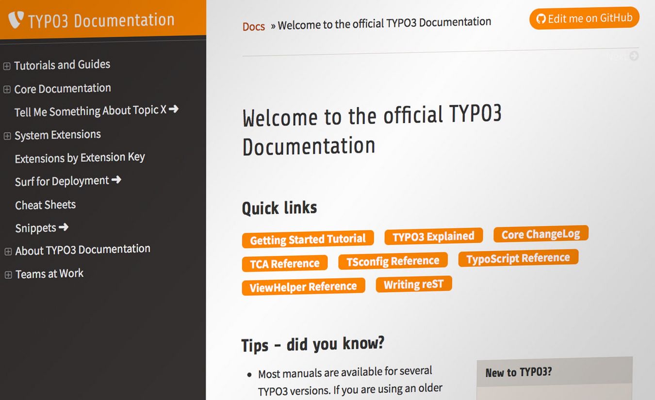 When I saw the “Edit me on Github” button for the first time in the official TYPO3 documentation I thought “Who am I to edit the official TYPO3 documentation?!” However, when I found an obvious error (typo in code) I hit that button and sent in a correction. The response from the Docs Team was instant and positive so I felt encouraged to submit some more small changes. However, doing large scale edits in the GitHub editor was tiresome and I didn’t dare either.