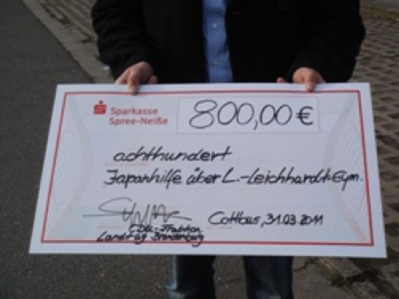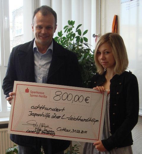 Am Donnerstag, den 31.03.2011, besuchte der CDU-Landtagsabgeordnete, Prof. Dr. Michael Schierack, das Ludwig-Leichhardt-Gymnasium in Cottbus. Grund des Besuches war eine Spendenscheckübergabe für „Cottbus hilft Japan“. Er übergab im Namen der gesamten CDU-Landtagsfraktion Brandenburg einen Scheck über 800 Euro an die Schülerin Alina Maaz, die am Unglückstag als Austauschschülern in Japan vor Ort war. Er und seine Fraktionskollegen im Landtag Brandenburg wollten den Opfern der Erdbeben- und Tsunamikatastrophe unbedingt helfen. Das gesammelte Geld wird direkt an ein Weisenheim in Japan überwiesen, zu dem das Ludwig-Leichhardt-Gymnasium in engem Kontakt steht.