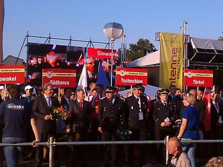 Der Oberbürgermeister Frank Szymanski begrüßte die Feuerwehrsportler aus 17 Nationen in Cottbus und gratulierte dem Präsidenten des Stadtfeuerwehrverbandes, Dr. Wolfgang Bialas, zu seinem Geburtstag.