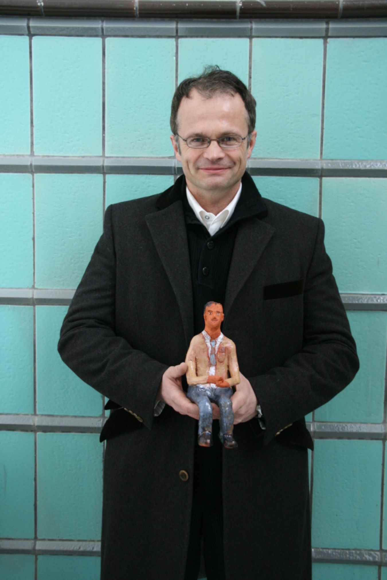 Foto 2: Prof. Dr. Michael Schierack mit der Tonfigur; (Foto: KUNSTMUSEUM DIESELKRAFTWERK COTTBUS)
